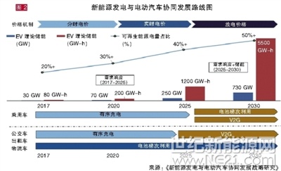 值得注意的是,《報告》發(fā)布了新能源發(fā)電與電動汽車協(xié)同發(fā)展路線圖(如圖2)?!叭鐖D所示,可再生能源發(fā)電量占比將從目前25%提升至50%以上,電動汽車儲能理論潛力也將從目前的30GW-100GWh提升至700GW-3800GWh。”劉堅強調(diào),在不同時段引入合理的價格機制和并網(wǎng)模式是發(fā)掘電動汽車儲能潛力的關鍵。